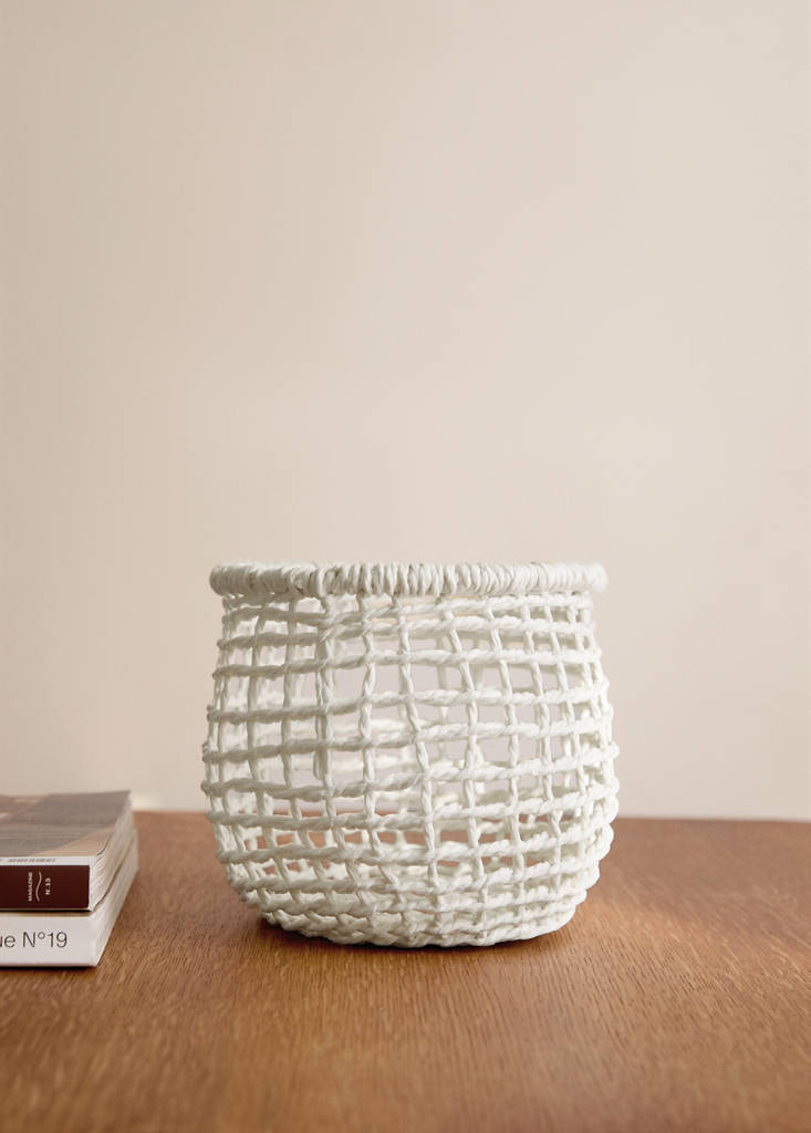100% paper. Diameter: 12.5 cm. Height: 12 cm. Decorative and functional basket. Without handles. 100% paper, functional and with a rustic style. Perfect for any room or use; such as storing clothes, towels, blankets or various objects. Available in two colours