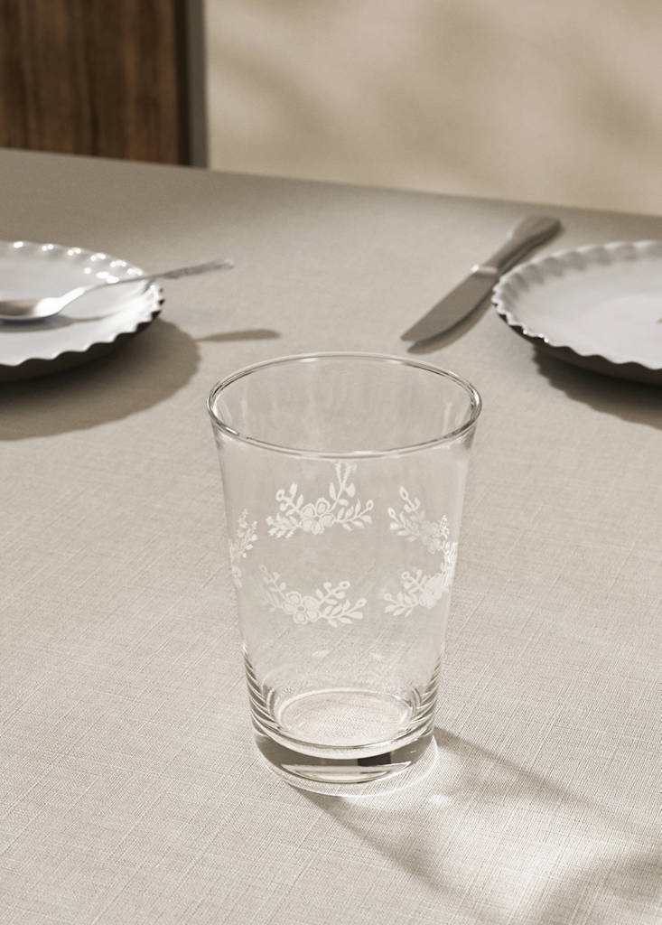 100% glass. Diameter: 7.8cm. Height: 11cm. Capacity: 290ml. Transparent design. Flower details. Timeless design. Dishwasher safe. Adds a touch of simplicity and elegance to your table. Coordinates with more items from the collection
