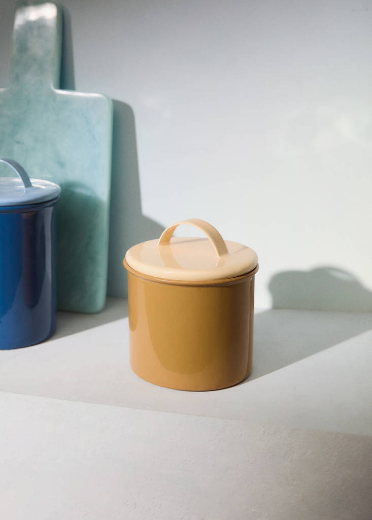 Large stainless steel jarCurrent price [€ 22,99 ]€ 22,99Select a colourVanillaSelect your sizeSNot available. I want it!Notify meAdd to WishlistSee lookFree delivery to store100% stainless steel. Size: 18x13.5 cm. With lid. Two-tone design. Available in a different size. It can store foodDetails, composition and careStore availability
