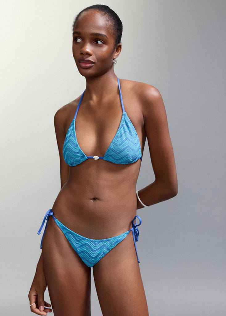 Bikini set. Stretch fabric. Triangle silhouette. Textured fabric. Zig-zag design. Bow fastening on the neck. Side Tie Closures. Adjustable tie details. Shell detail. Mid-rise briefs. Swimwear collection