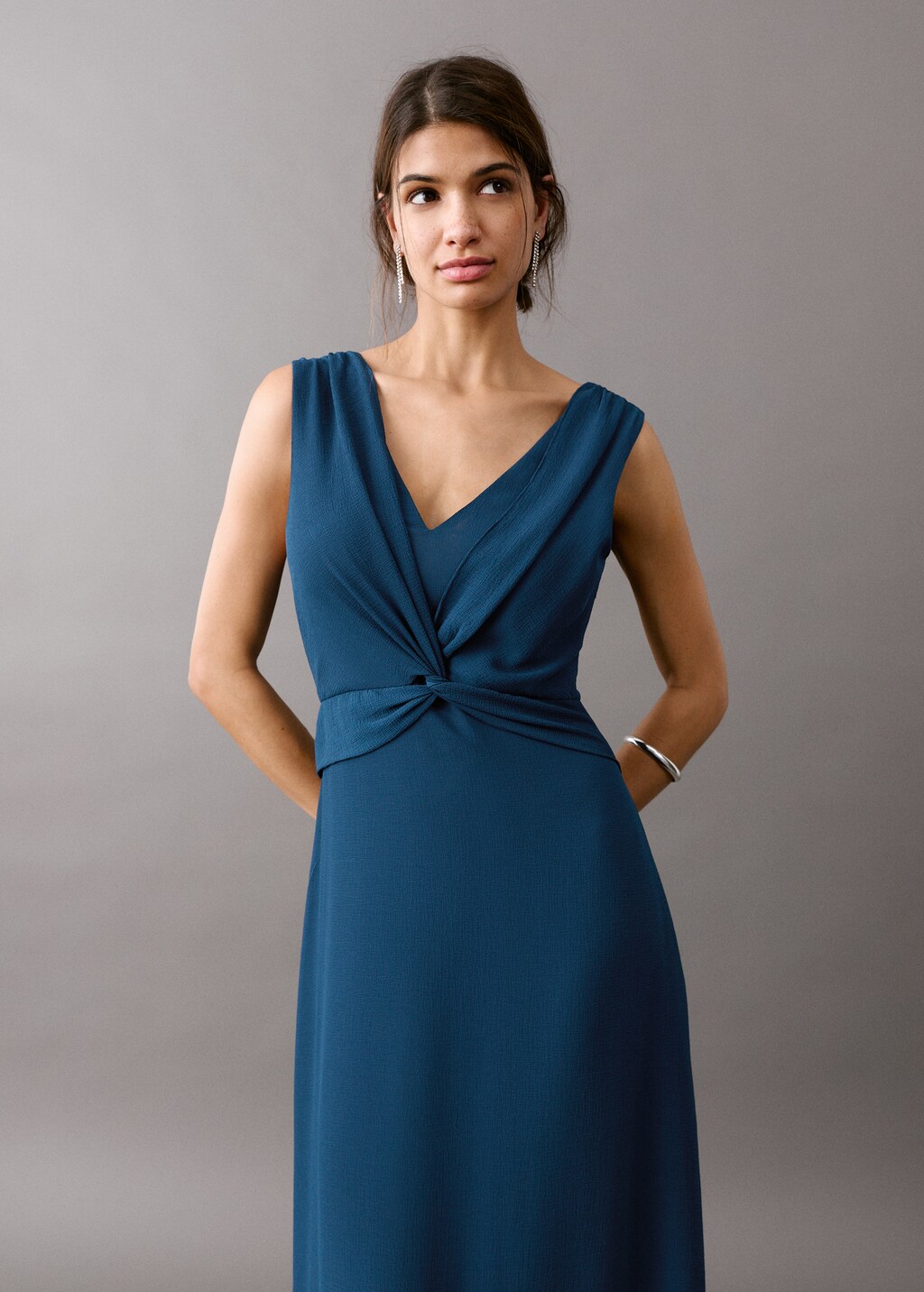Fluid fabric. Straight design. Long design. V-neck. Wide straps. Gathered detail on the chest. Invisible side zip fastening. Party and events collection.