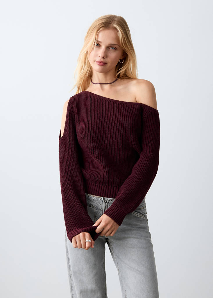 Asymmetrical sweater with shoulder openingInitial price struck through [€ 29,99 ]€ 29,99Current price [€ 17,99 ]€ 17,99-40%Select a colourMaroonSize change - Consult the Size GuideSelect your sizeXXSXSSMLDimensionsAddAdd to your wishlistSee lookFree delivery to storeKnitted fabric. Asymmetric design. Boat neckline. Long sleeves. Shoulder openingDetails, composition and careStore availability