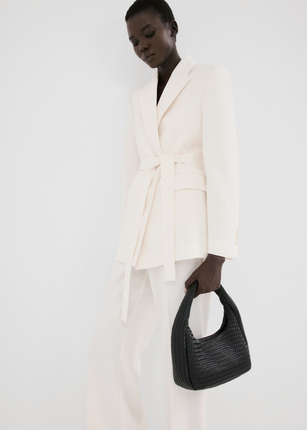 Suit style. Fitted design. Lapel-collar V-neck collar. Lapel with notch. Long sleeves with buttoned cuffs. Two pockets with flaps on the front. Button closure. Inner lining. Total look. Available Plus.