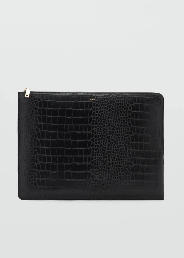 Large. Faux leather. Zip closure. Interior pocket. Debossed logo. Inner lining. Office looks. Size 15 inch. Crocodile effect. Animal print. Crocodile skin. Zip fastening. Inner lining. 36x2x27