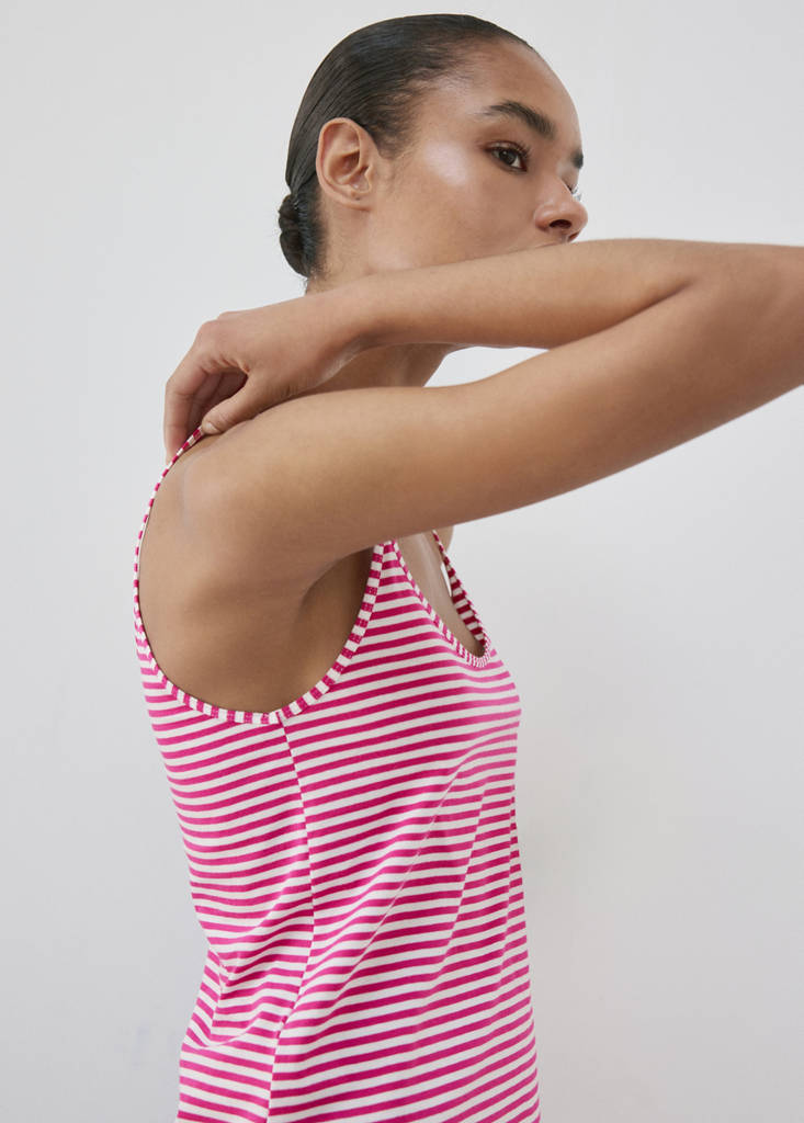 New NowWoven stripe cotton topCurrent price [€ 19,99 ]€ 19,99Select a colourFuchsiaThe model is wearing size S and is 180cm tall.Select your sizeSMLDimensionsAddAdd to your wishlistSee lookFree delivery to store100% Cotton. Thin straps. Woven stripe. Round neck. Combines comfort and style. Complete with more products from the collectionDetails, composition and careStore availability