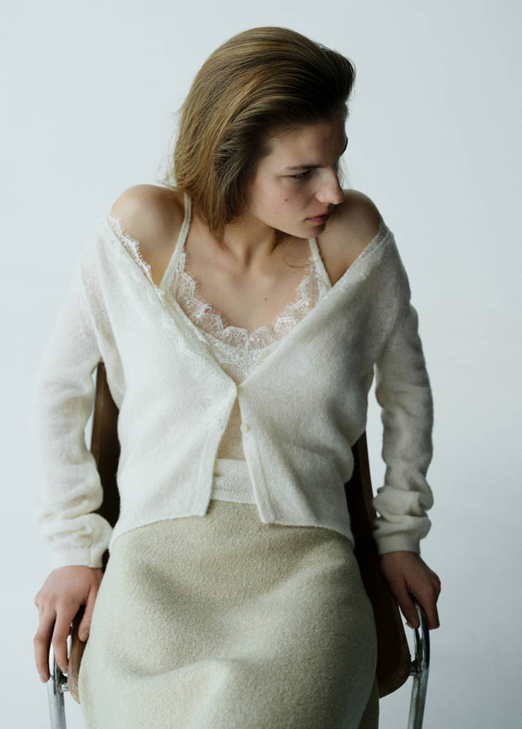 Knit fabric. Straight design. Lace neckline. V-neck. Long sleeves. Front closure. Total look