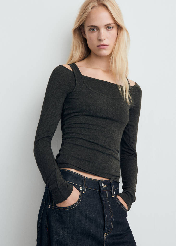 Fine knit fabric. Fitted design. Combined design. Round neck. Long sleeves. No Fastening