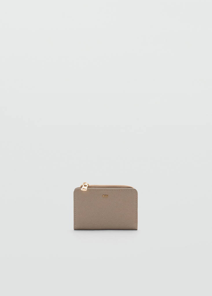 Effet saffiano. Petite taille. Plusieurs inserts à cartes. Fermeture Éclair. Fermeture métallique à pression. Logo en relief. Coutures décoratives