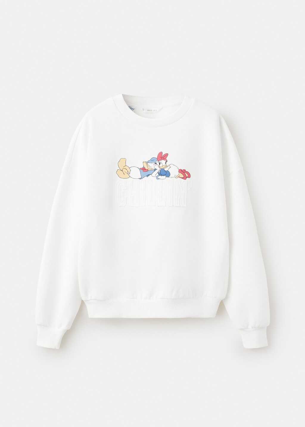 Tissu 100% coton. Design droit. Col rond. Manche longue. Imprimé Daisy. Donald Duck. Détail de texte brodé sur la poitrine. Col, poignets et ourlet côtelés. Licences.