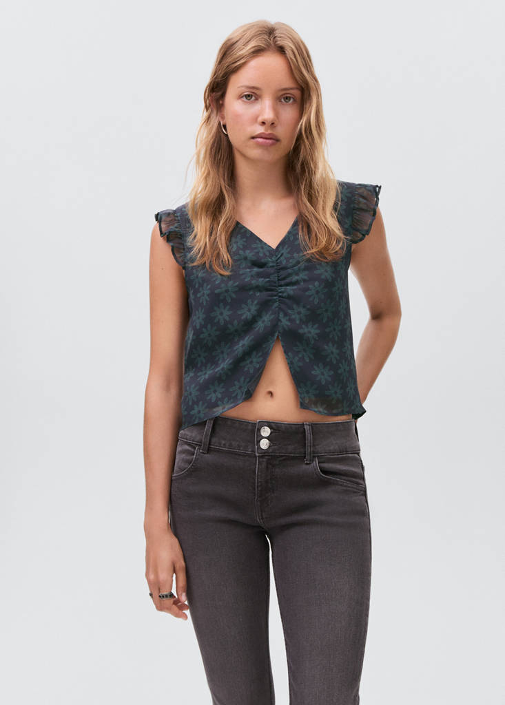 Confectionnée dans un tissu fluide, cette pièce affiche un motif fleuri et une coupe droite. Le col en V est complété par des volants sur les manches et un détail froncé sur la poitrine. Comprend un bas fendu et doublure, sans fermeture