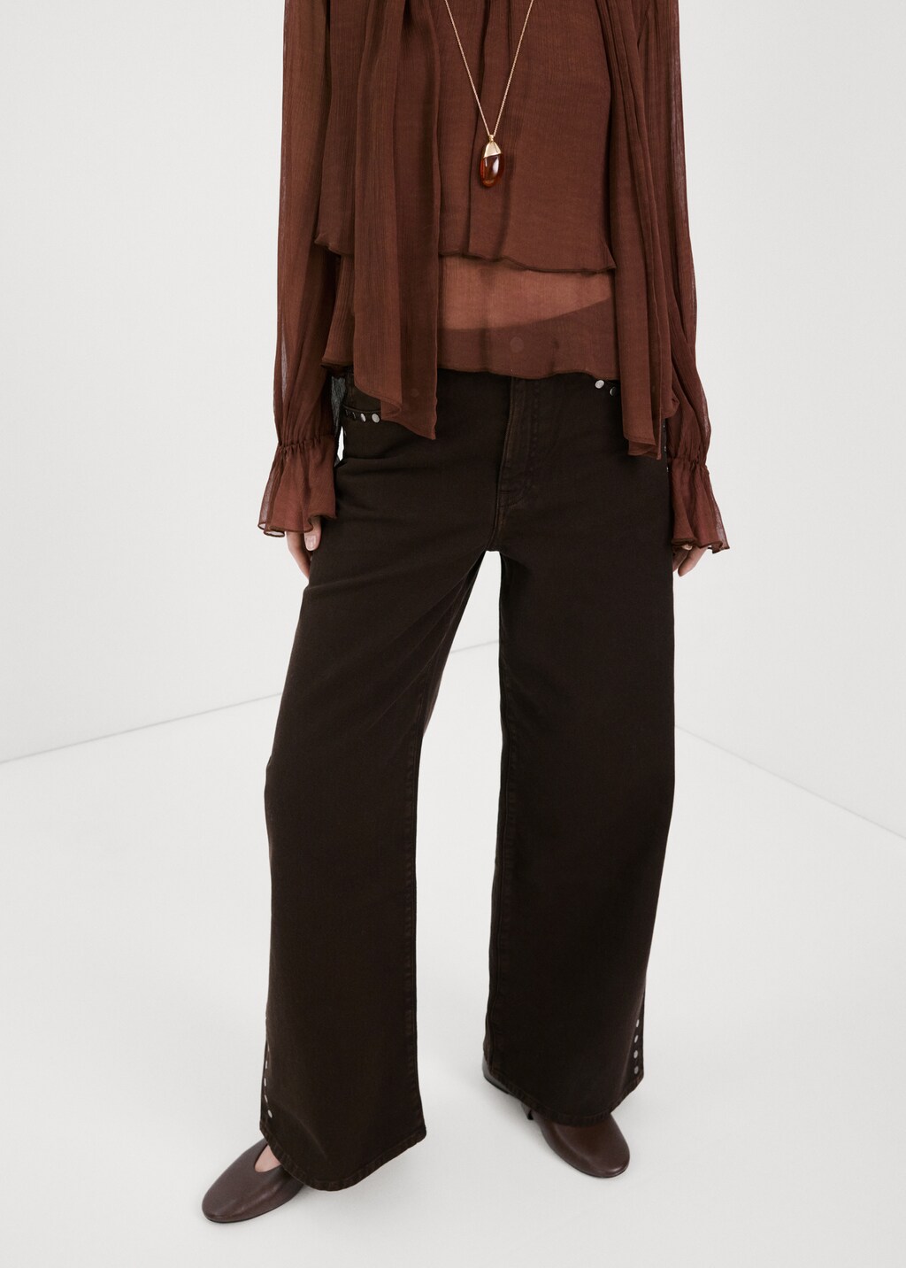 Denimachtige katoenen stof. Wide leg ontwerp. Lang ontwerp. Detail van studs. Middelhoge taille. Riemlussen. Vijf zakken. Knoop- en ritssluiting.