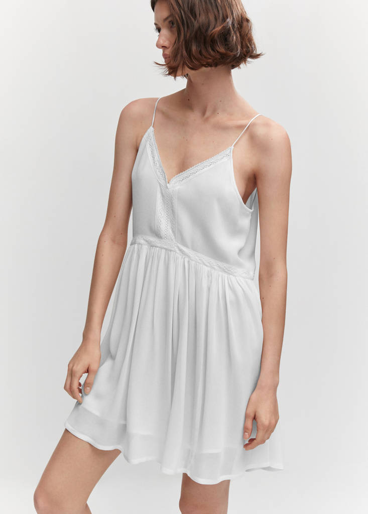 Tessuto fluido, tessuto semitrasparente, modello diritto, modello corto, modello semitrasparente, collo a V, spallini sottili, dettagli ricamati, fodera interna.