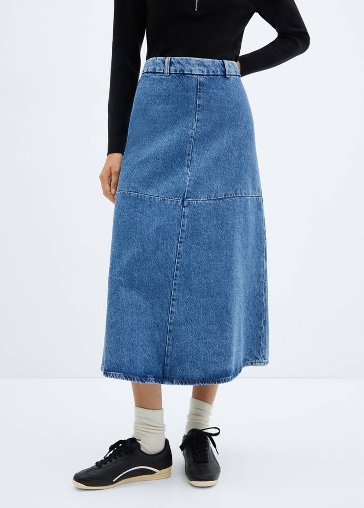 Katoen- en lyocellblend, midimodel, a-lijn model, high-waist, ritssluiting aan de achterkant, ceintuurlusjes, sierstiksels.