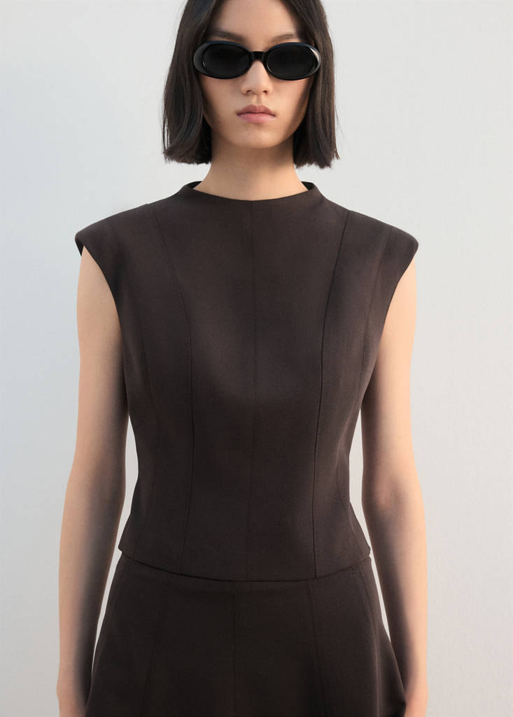 Getailleerd ontwerp. Mouwloos. Stiksel details. Brede schouderband. Ronde hals. Knoopsluiting bij de hals. Total look.
