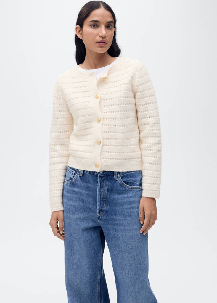Exclusief OnlineGebreid vest met ajourdetailsHuidige prijs [€ 59,99 ]€ 59,99Kies een kleurEcruHet model draagt maat S en is 170cm lang.Kies je maatXXSXSSMLXLXXLAfmetingenAan Favorieten toevoegenLook bekijkenGratis verzending naar winkelStof van wolblend. Middengrof breisel. Opengewerkte brei. Recht ontwerp. Standaard ontwerp. Ronde hals. Lange mouwen. Knopensluiting aan de voorkantDetails, samenstelling en verzorgingVoorradig in de winkel