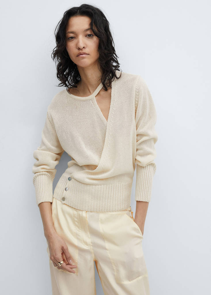 Breisel. Kruisontwerp. Ronde hals met split. Lange mouwen. Zijsluiting met knopen. Geribbelde afwerkingen