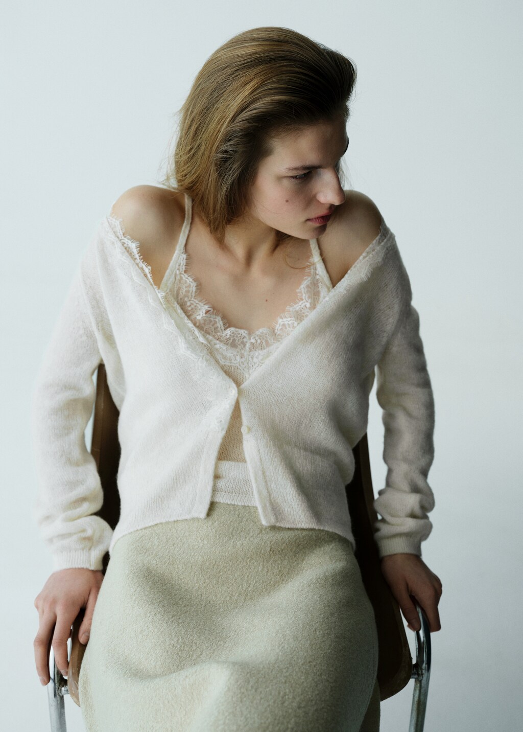 Breisel. Recht ontwerp. Kantdetail. V-hals. Lange mouwen. Voorsluiting.