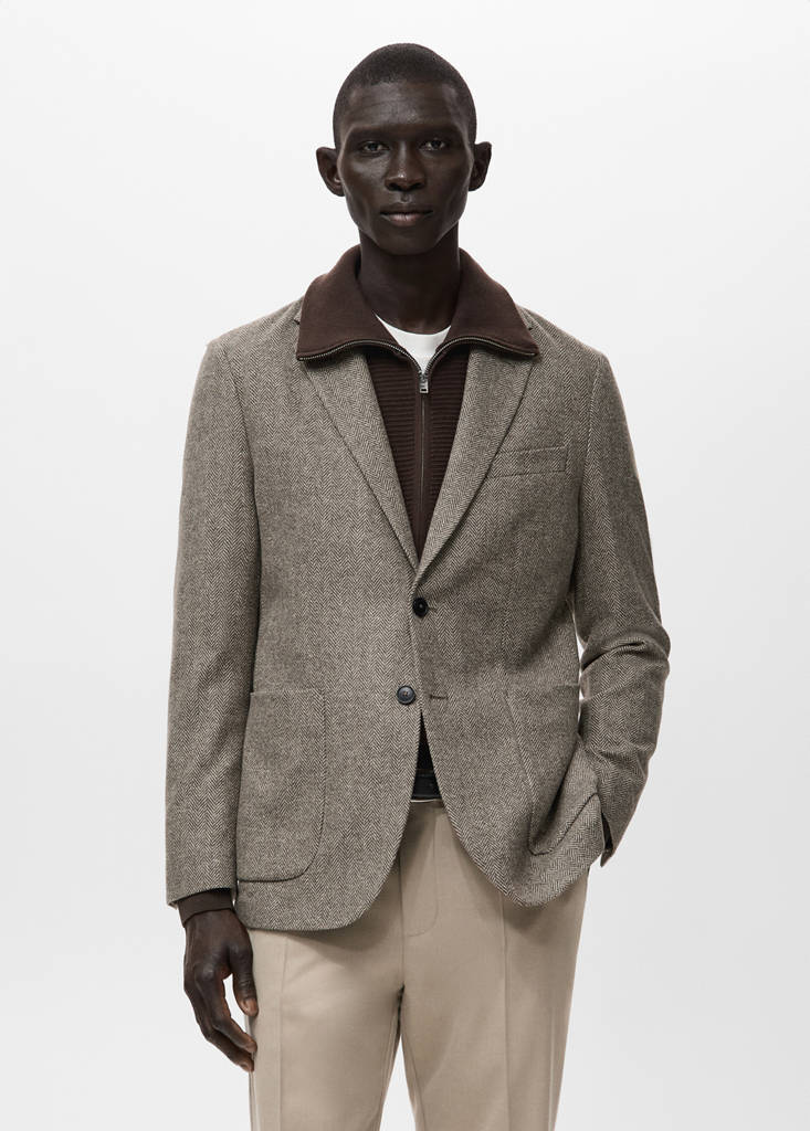 Slim-fit. Driehoekige haakrevers met knoopsgat. Visgraatdessin. Twee opgestikte zakken aan de voorkant. Borstzak met bies. Binnenzak. Binnenvoering. Lange mouw met geknoopte manchet. Voorste knoopsluiting.
