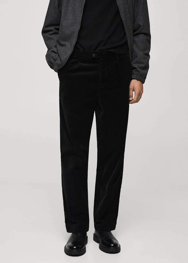 Corduroy. Middelhoge taille. Katoenmix stof. Dubbele knoop- en ritssluiting. Riemlussen. Voorplooi detail. Twee voorzakken. Twee klepzakken met knoop aan de achterkant. Rechte zoom. De kleuren bruin en zwart zijn exclusief online verkrijgbaar. Straight-fit