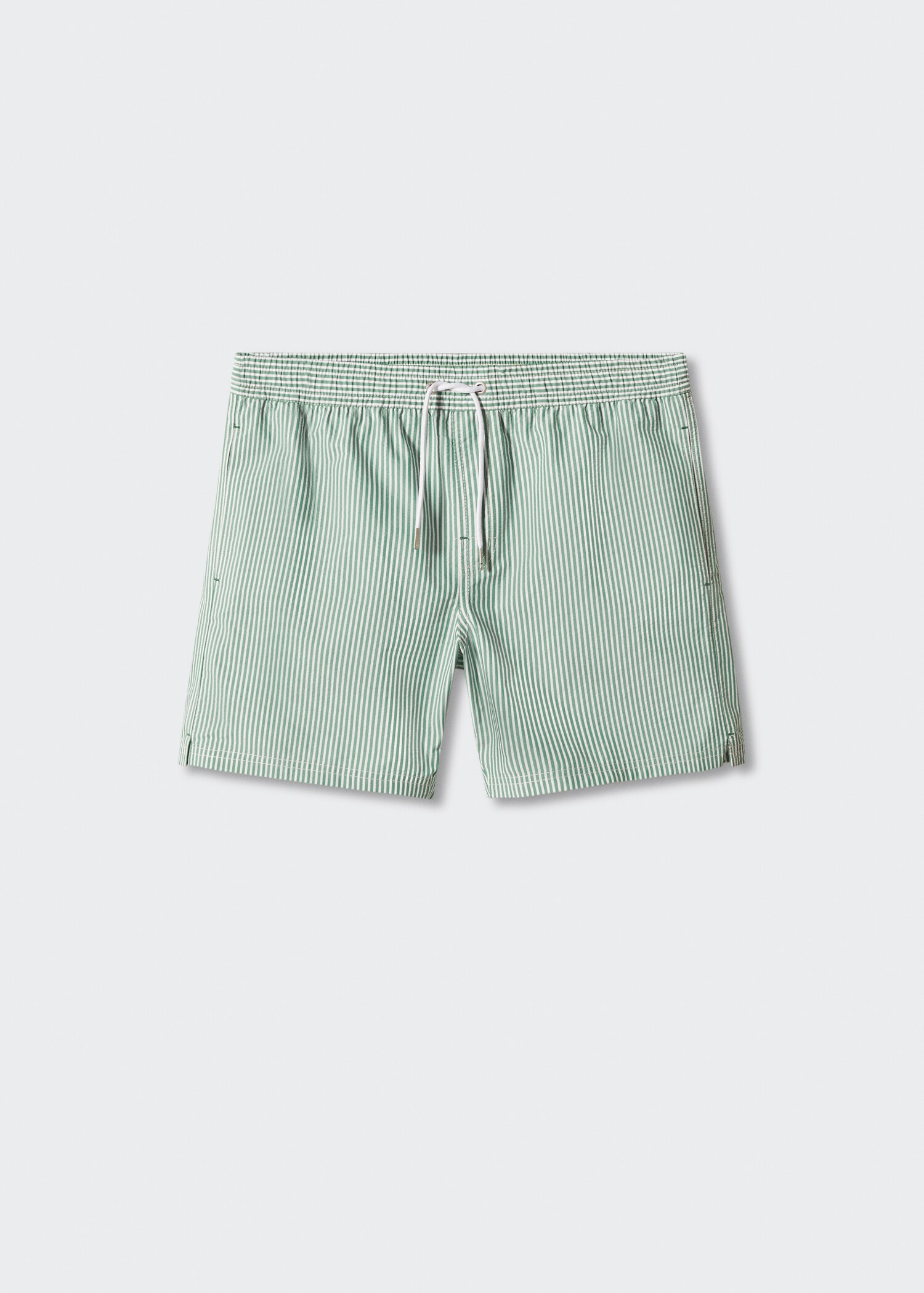 Blend van katoen en polyester. Medium model. Elastische tailleband met aansnoerkoord. Twee zakken aan de voorkant. Opgestikte zak aan de achterkant met klittenband. Binnenzak. Voering. Het model is 190 cm lang en draagt maat M.