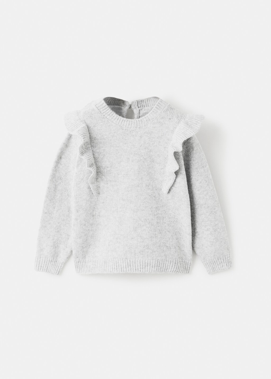 Tejido de punto. Tejido de lúrex. Diseño recto. Cuello redondo. Manga larga. Detalle de volante en los hombros. Terminaciones en canalé. Cierre de botón en la parte posterior.