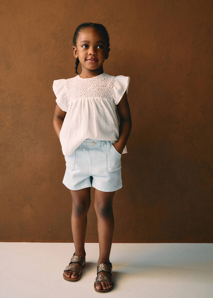 Tejido de algodón estilo tejano vaquero. Diseño recto. Diseño corto. Trabillas. Dos bolsillos laterales. Dos bolsillos de parche en la parte posterior. Cierre de botón a presión. Cintura elástica tipo paperbag