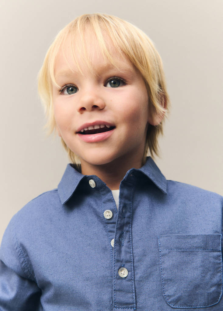 100% algodón. Diseño recto. Regular fit. Cuello camisero. Manga larga con puños abotonados. Bolsillo en la parte frontal. Cierre delantero con botones