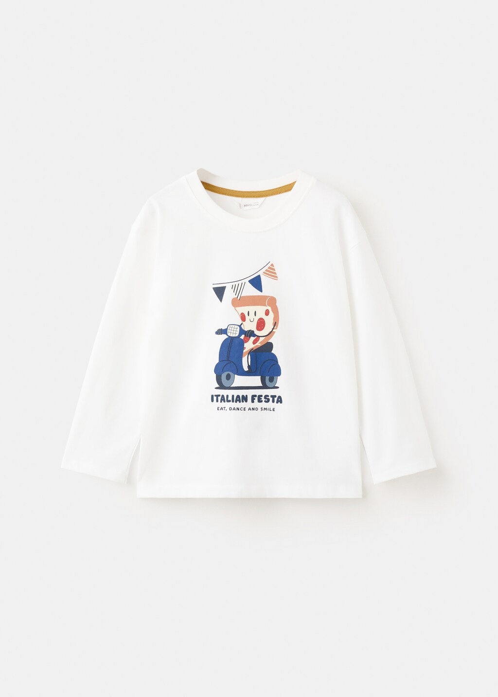 Tejido 100% algodón. Diseño recto. Cuello redondo. Manga larga. Dibujo estampado en el pecho.