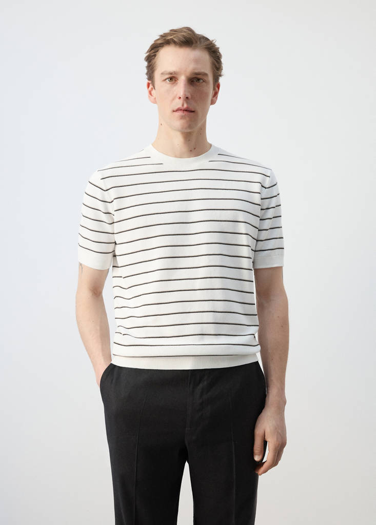 New Now / Exclusivo onlineCamiseta algodón punto rayasPrecio actual [US$ 49.99 ]US$ 49.99Selecciona un colorBlanco rotoEl modelo lleva la talla M y mide 185cm.Selecciona tu tallaSMLXLXXL¡Últimas unidades!MedidasAñadirGuardar como favoritoVer lookEnvío gratis a tiendaTejido 100% algodón. Tejido de punto fino. Diseño recto. Estampado Rayas. Cuello redondo. Manga corta. Ribetes en canalé. Sin cierre. Exclusivo OnlineDetalles, composición y cuidadosDisponibilidad en tienda