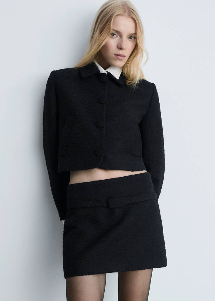 Tejido tweed. Tejido mezcla de algodón y lana. Diseño recto. Diseño crop. Cuello camisero. Manga larga. Dos bolsillos laterales. Cierre delantero con botones. Forro interior. Total look