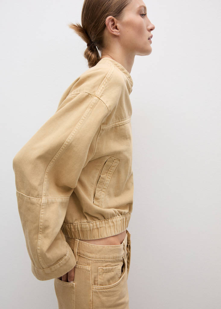 Tejido de algodón estilo tejano vaquero. Diseño bomber. Diseño recto. Cuello redondo. Manga larga. Dos bolsillos laterales. Cierre de cremallera. Largo interior 79,5 cm