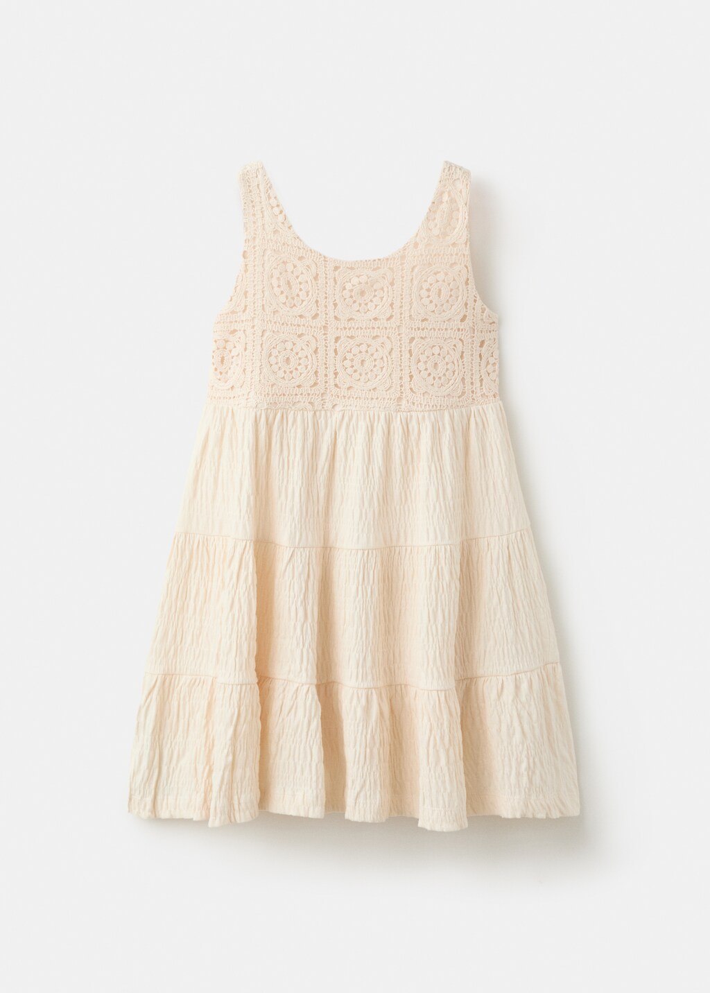 Tejido de algodón. Diseño evasé. Diseño corto. Cuello redondo. Tirantes. Detalles bordados. Panel con textura.