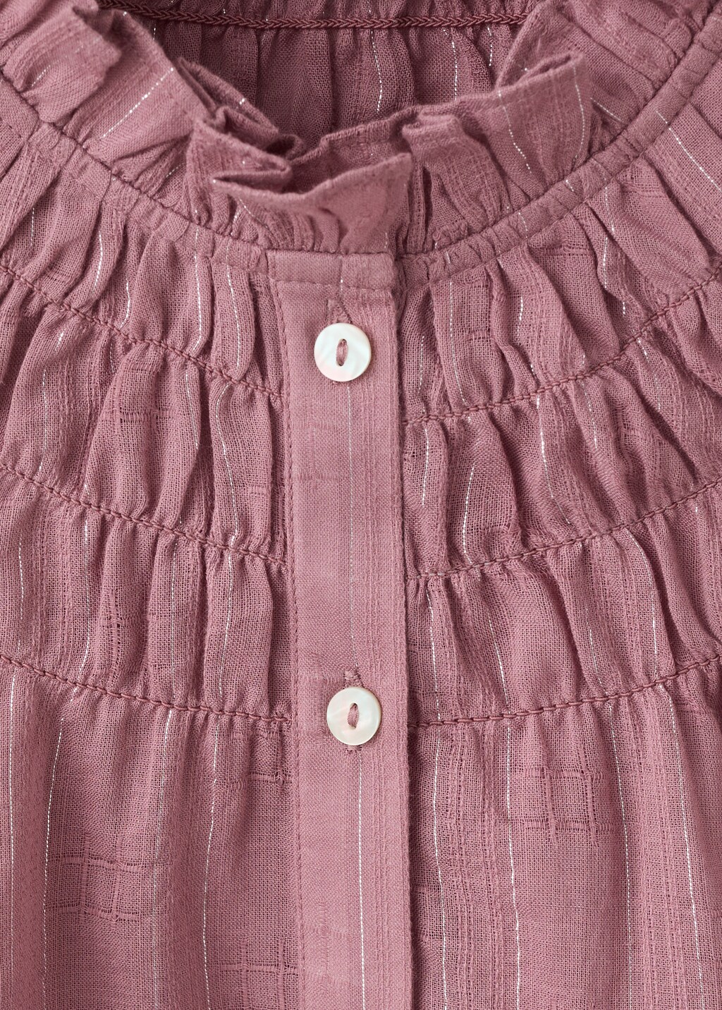 Tejido de algodón. Tejido fluido. Diseño recto. Cuello redondo. Detalle fruncido en el cuello. Manga corta abullonada. Cierre delantero con botones. Detalles de lúrex.