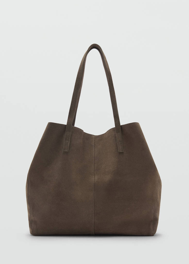 100% bovine leather. Suede. Large. Shopper style. Double handle. Shoulder strap. Tie fastening. Interior pocket