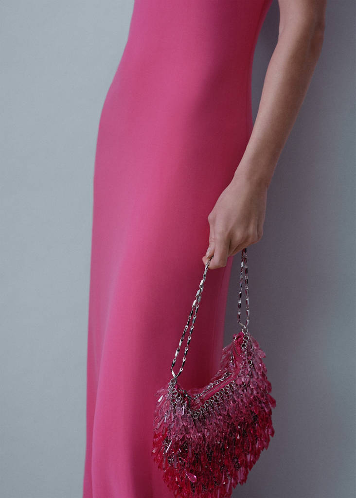 A dream bag: shiny beads, a fine double chain and its fuchsia pink colour, the trend this season, make it the most special bag that can accompany you in your seasonal events.. Double chain handle. Stones details. Zip fastening. Party and events collection