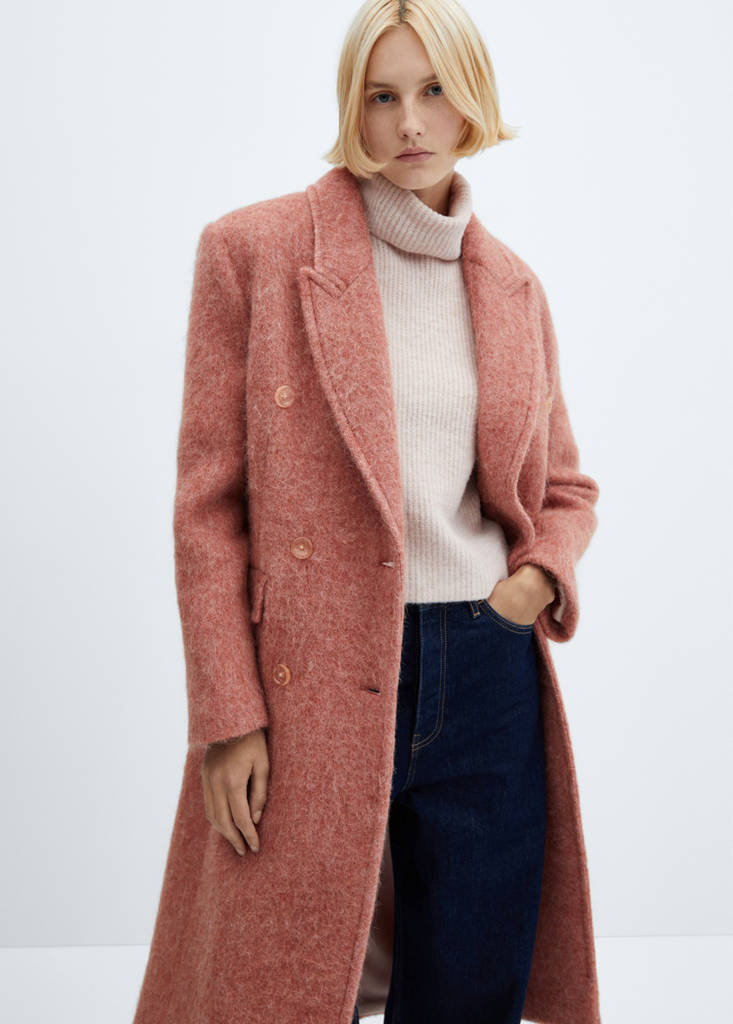 Wool mix fabric. Straight design. Long design. Lapel-collar V-neck collar. Long sleeves. Two front welt and flap pockets. Double button fastening. Inner lining