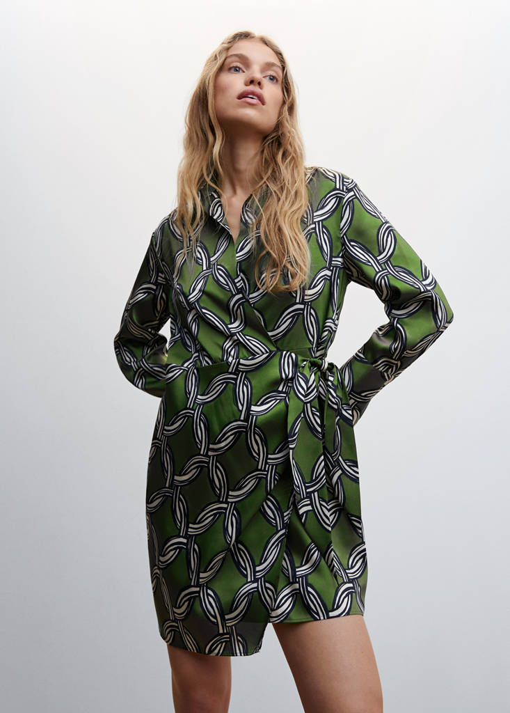 Flowy fabric. Satin. Chain print. Short design. Straight design. Shirt-style collar. Crossed V-neck. Long sleeve. Knot closure. Plus Size Available. Party and events collection
