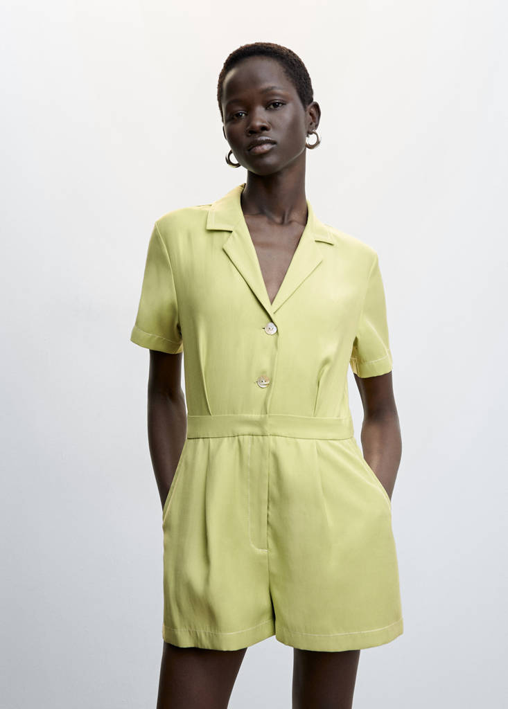 Flowy fabric. Straight design. Shirt-style collar. Short design. Short sleeve. Button fastening on the front section