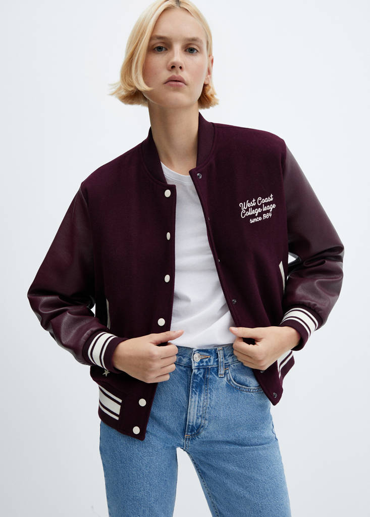 Wool mix fabric. Heavy structure. Bomber design. Round neck. Long sleeves with elastic cuffs. Contrasting sleeves. Two side pockets. Front snap button closure. Hem with elastic band. Embroidered message. Inner lining