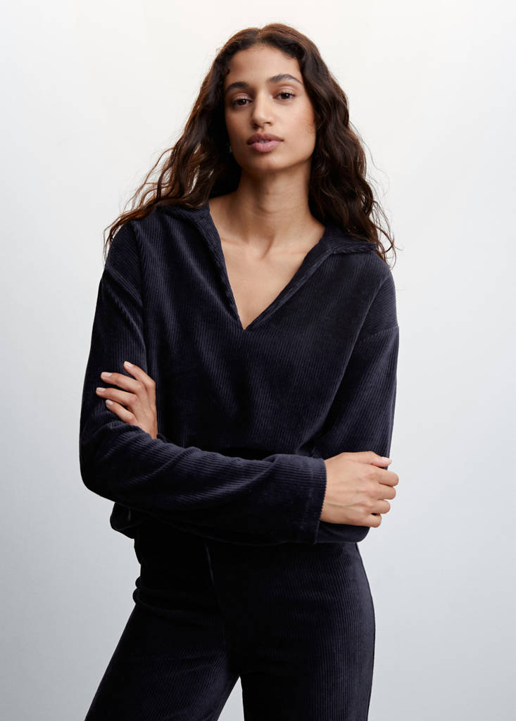 Corduroy fabric. Cotton-blend fabric. Straight design. Polo neck. V-neck. Long sleeve. Co-ord