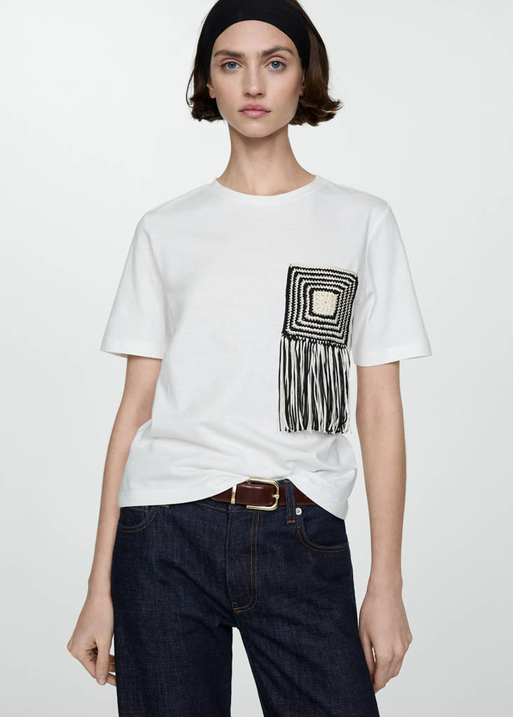 Crochet detail T-shirtCurrent price [€ 1,300.00 ]€ 1,300.00Select a colourWhiteThe model is wearing size S and is 177cm tall.Select your sizeXXSXSSMLXLXXLSize guideAdd to WishlistSee lookFree delivery to storeSee availability in storeDescriptionStraight design. Round neck. Short sleeves. Crochet detail. Fringe detail. 100% cotton fabric.See detailsShare