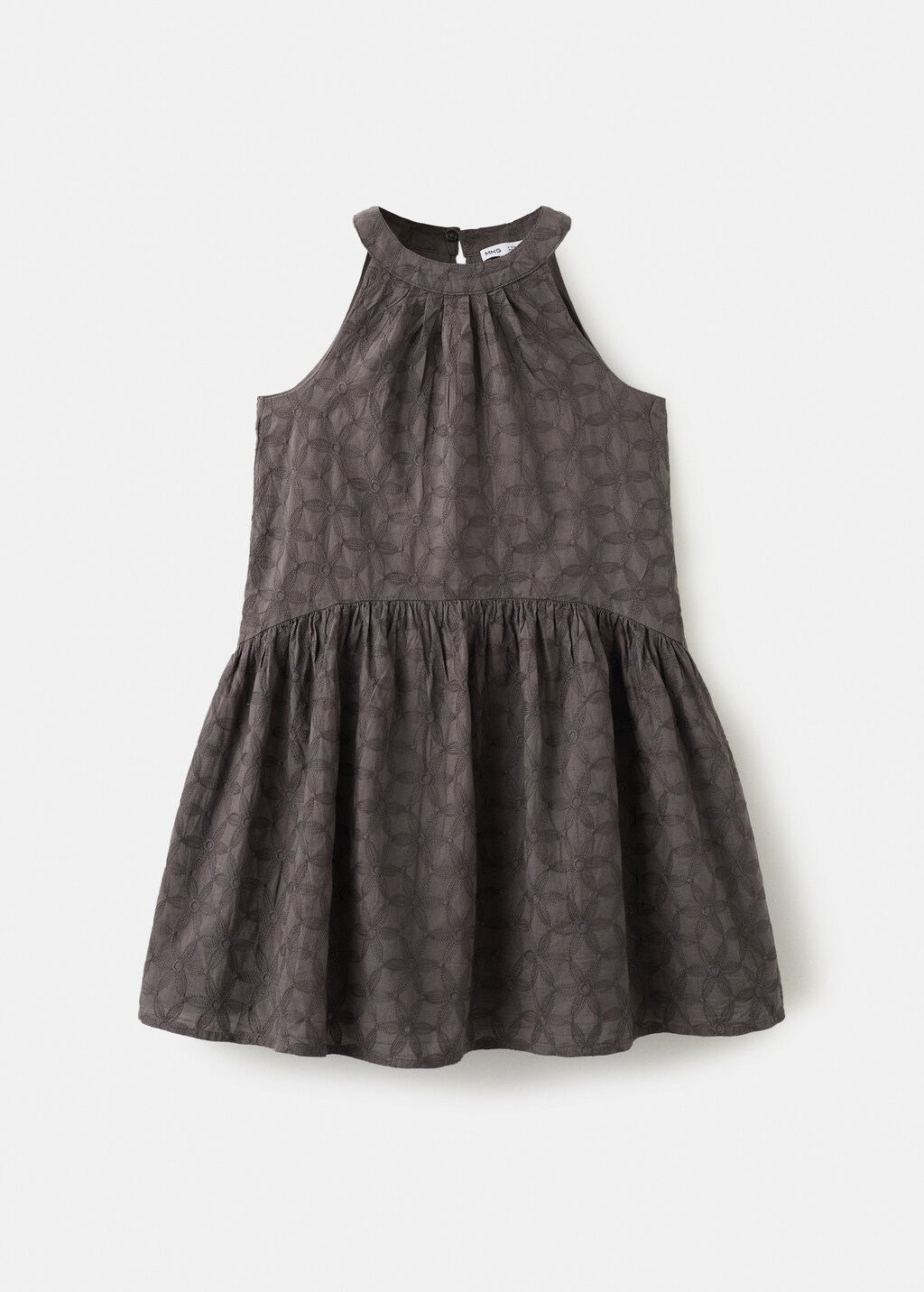 100% cotton fabric. Fluid fabric. A-line design. Halter neck. Embroidered floral details. Teardrop fastening at back.