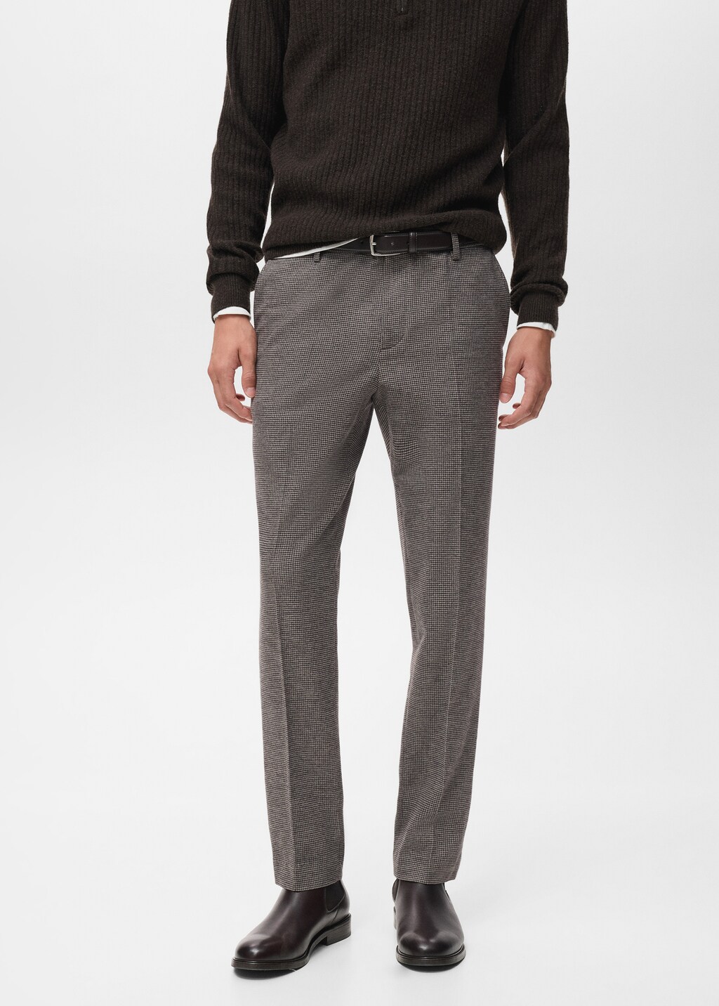 Slim fit. Soft cotton flannel. Micro houndstooth print. Ironed stripe detail at front and back. Front fastening with double-breasted buttons and zip. Two welt pockets with button at the back. Belt loops.