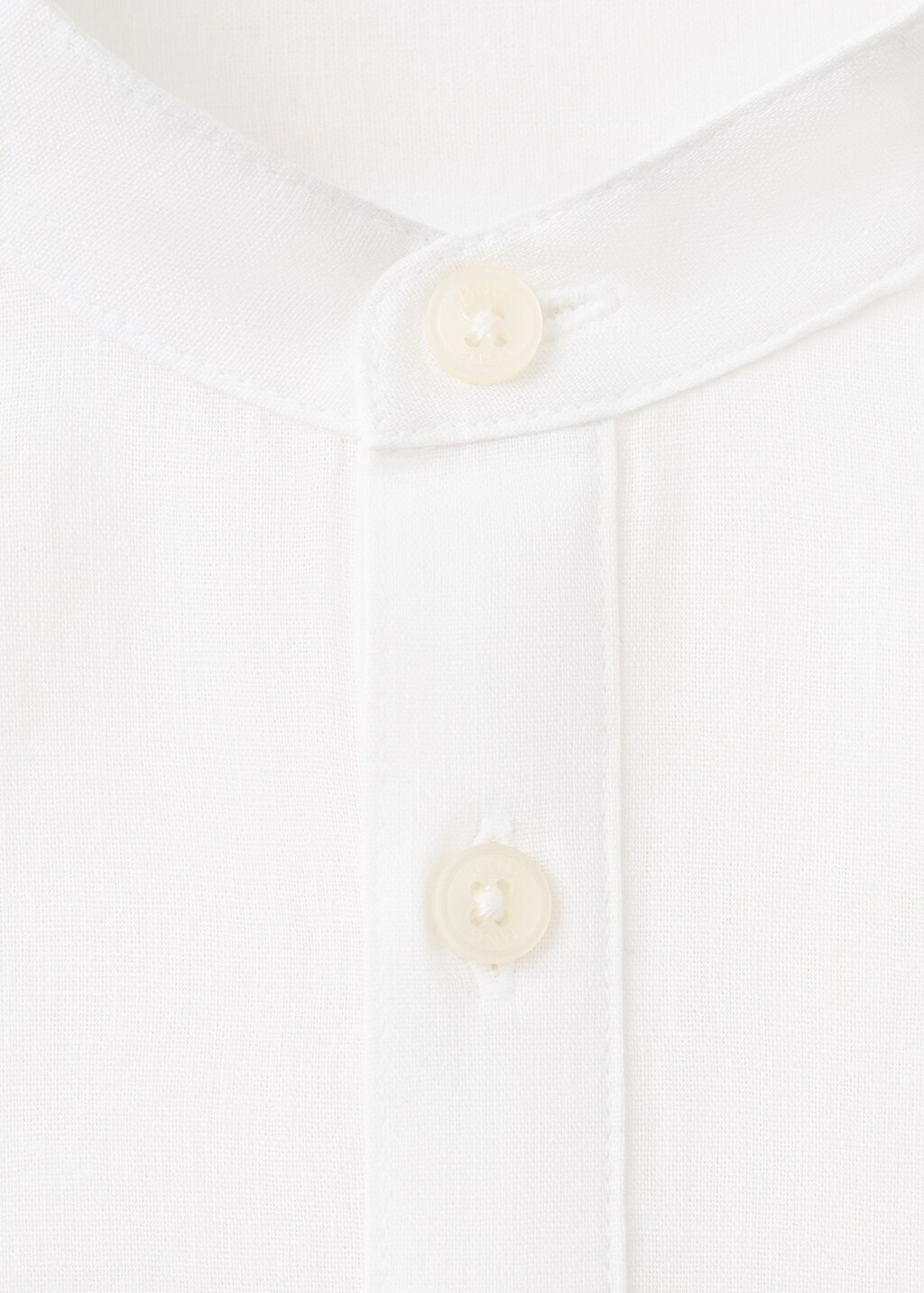 Linen and cotton blend fabric. Straight design. Stand-up collar. Long sleeves with buttoned cuffs. Front closure with buttons.