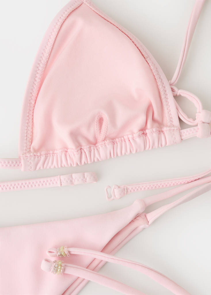 Triangular design. V-neck. Microbead embroidered appliqués. Floral design. Thin straps. Back hook fastening. Set Available. Detachable filling