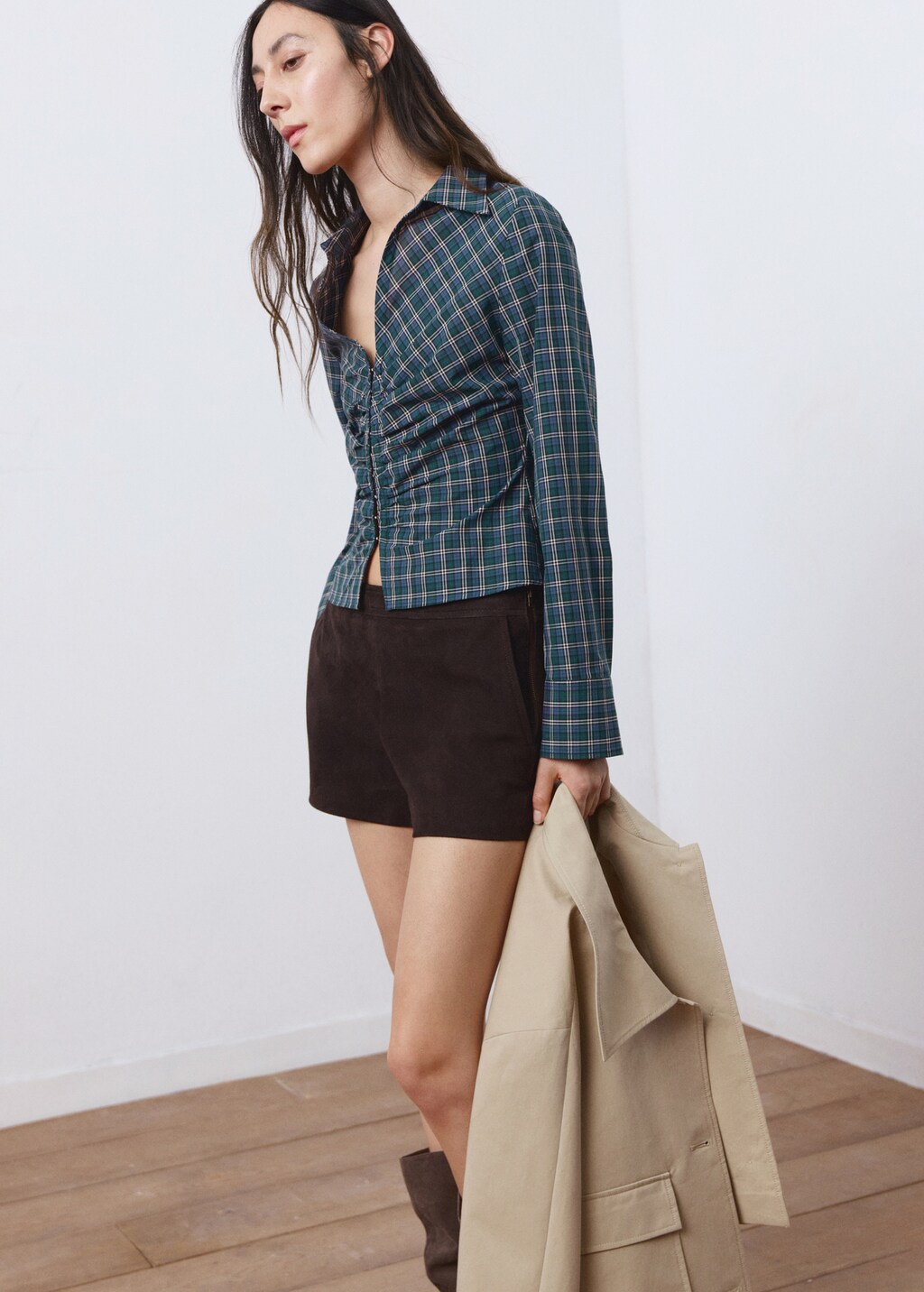100% cotton fabric. Tailored Design. Ruched details. Shirt collar. Long sleeves with buttoned cuffs. Hook fastening.