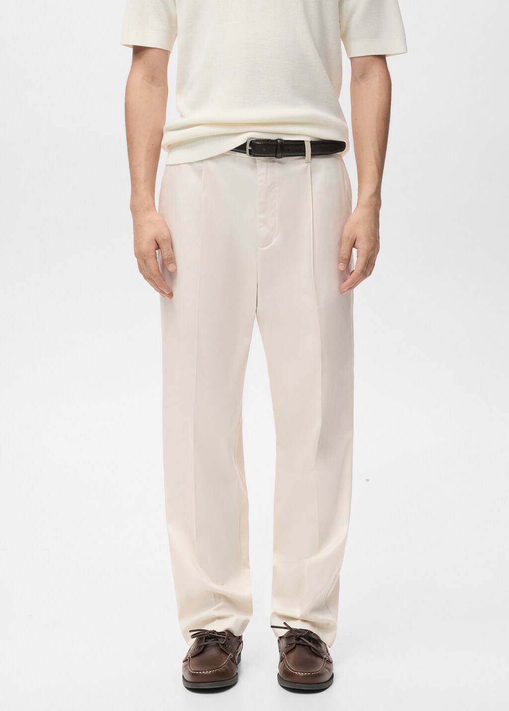 Coupe régulière. Tissu en mélange de coton et Lyocell. Détail de pli à l'avant. Deux poches latérales. Deux poches passepoilées avec bouton à l'arrière. Fermeture Éclair et bouton à l’avant. Passants pour ceinture.