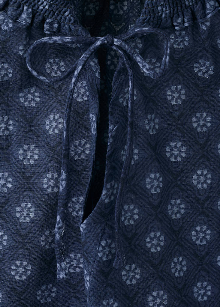 Tissu 100 % coton. Coupe droite. Motif imprimé. Col halter. Détail froncé au col