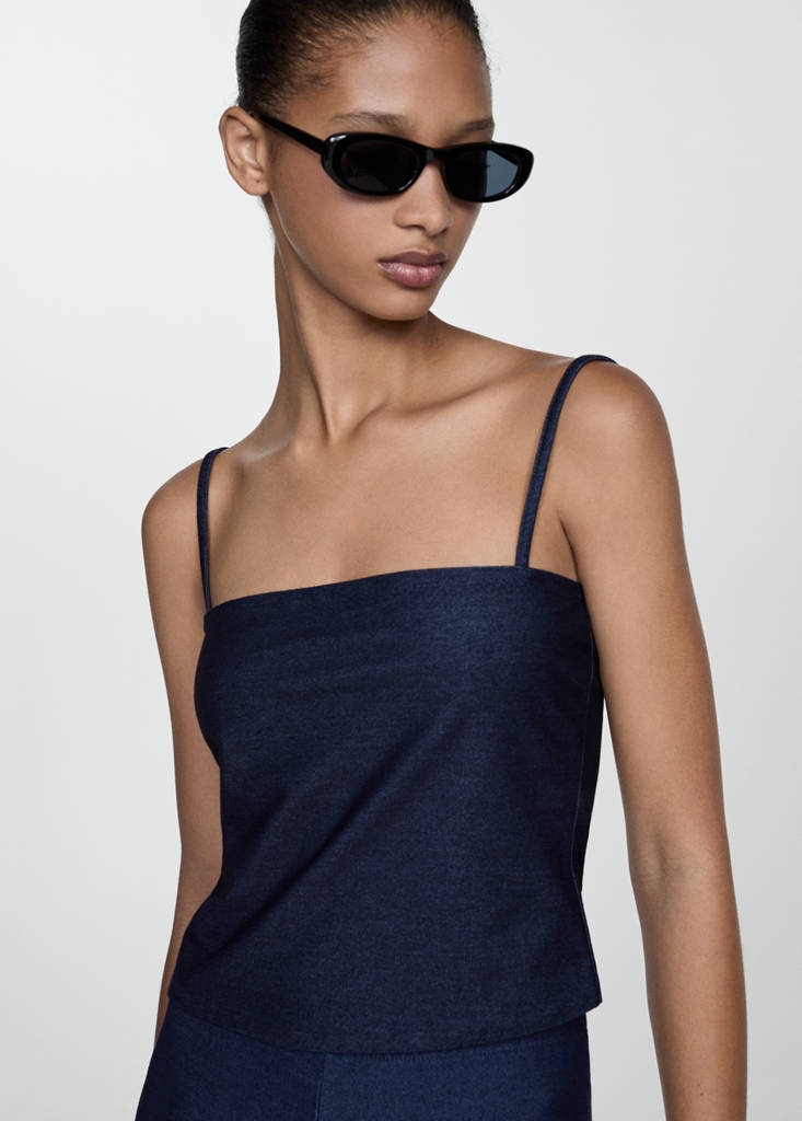 Design crop. Col carré. Sans manches. Bretelles fines. Total look. Coupe cintrée