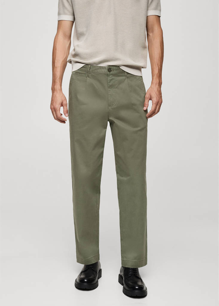 Tissu en coton. Fermeture avant à double boutonnage et fermeture éclair. Détail de pli à l'avant. Poche gousset au niveau des hanches. Deux poches latérales. Deux poches passepoilées avec bouton à l'arrière. Ourlet droit